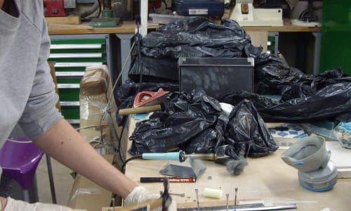 Learn each stage of the stained glass process: line cutting, painting with pigments, shading, highlighting, leading, firing and leading.