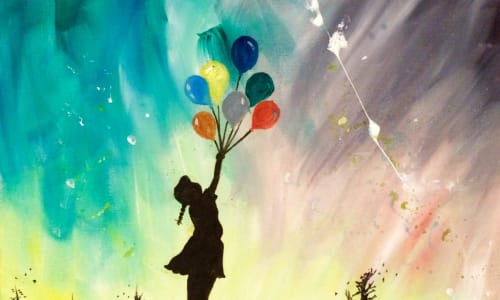 No experience is needed as you follow along with an artist facilitator who will guide you creating your own version of Banksy's Girl with the Balloon.