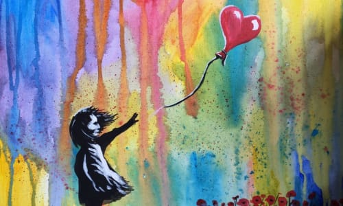 No experience is needed as you follow along with an artist facilitator who will guide you creating your own version of Banksy's Girl with the Balloon.