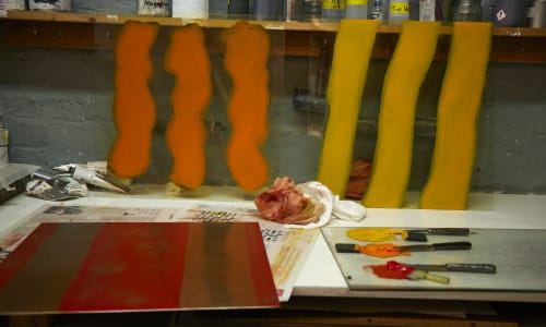 On this course you will make collagraph plates on acrylic sheets, thinking about how to make the most of different marks and the layers of colour possible by overprinting and by inking a la poupee. You will make marks with sandpaper, carborundum and acrylic paints, glue and mediums. The current studio exhibition by James Anderson will provide inspiration and you will look at artists Hughie O'Donahue, Gillian Ayres and Howard Hodgkin also.
