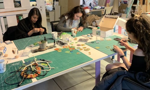 Materials: plastic bottle tops, wine cork, electric cable , fabrics, recycled…