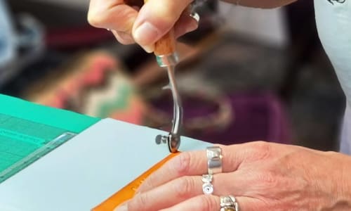 Everything is provided for the class, but please do wear trousers. (This may seem an unusual request, but you need to sit on the clam (the piece of equipment used for the stitching) and it is only comfortable in trousers.