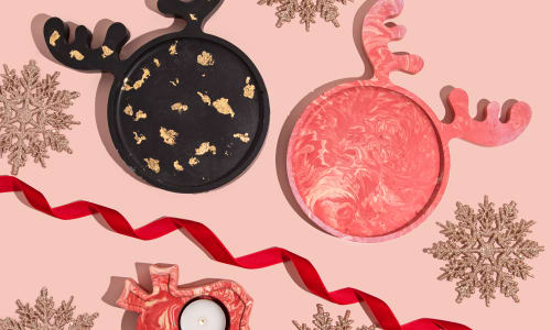 In this 90-minute workshop, you will learn how to pigment Jesmonite with different mixes of colours, and you will explore marbling and free-pouring techniques. You'll be making a chunky festive tealight holder which is around 12cms wide (and fits a standard 5cm tealight). You'll cast your festive tealight holder by pouring the material into silicone moulds. The tealight holder will then be sanded, sealed, and finished by me in my studio and posted to you within three working days.