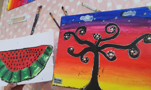 We will work with acrylics on canvas, watercolours, inks, pastels, clay, Powertex, sewing, textile crafts, paper crafts and more!