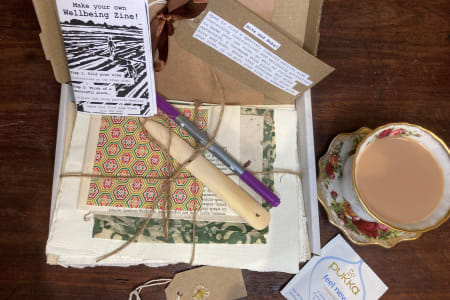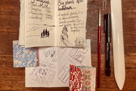 My art one to one involved paper folding using handmade papers to create my own 8-page book. I was then encouraged to recall a family event in my life and asked to explore why this memory remained significant - what senses were ignited during this memory: sounds, smells, textures etc. I filled the first pages with drawings inspired by this memory. I was then asked to detail the journey to that place in my memory, creating an adventurous map that filled more pages of my book. My book ended with a letter written to myself, promising to reconnect with family which was something niggling at me under the surface. There was no criticism of my style or ability, Sarah explores the personal story not the skill or method. She spent the whole time making something too so that the focus was never solely on me, but on what we could agree on together. What a wonderful experience and a truly unique piece of art as a result!